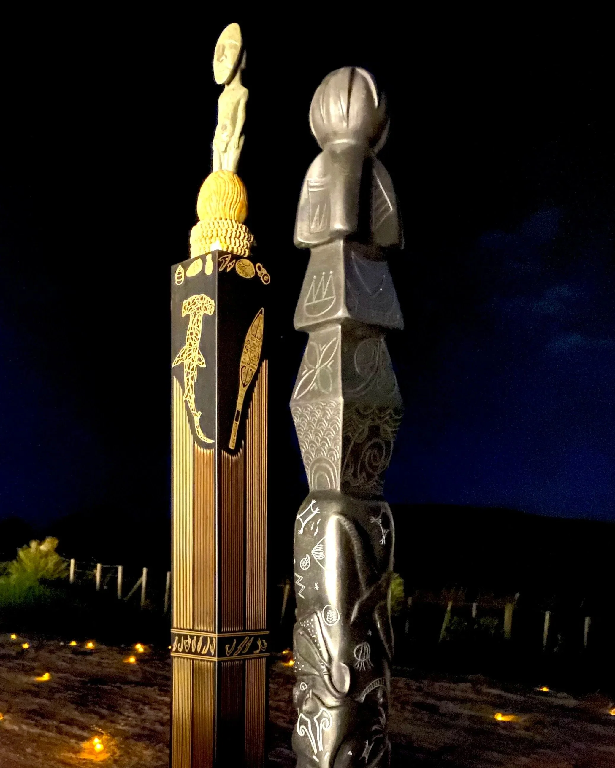 Cook Islands Ancestor is positioned through the pou as a record of ocean-based knowledge. Motifs of sharks, hooks, fish traps, and paddles articulate a relationship to fishing, navigation, and sustained engagement with the sea.