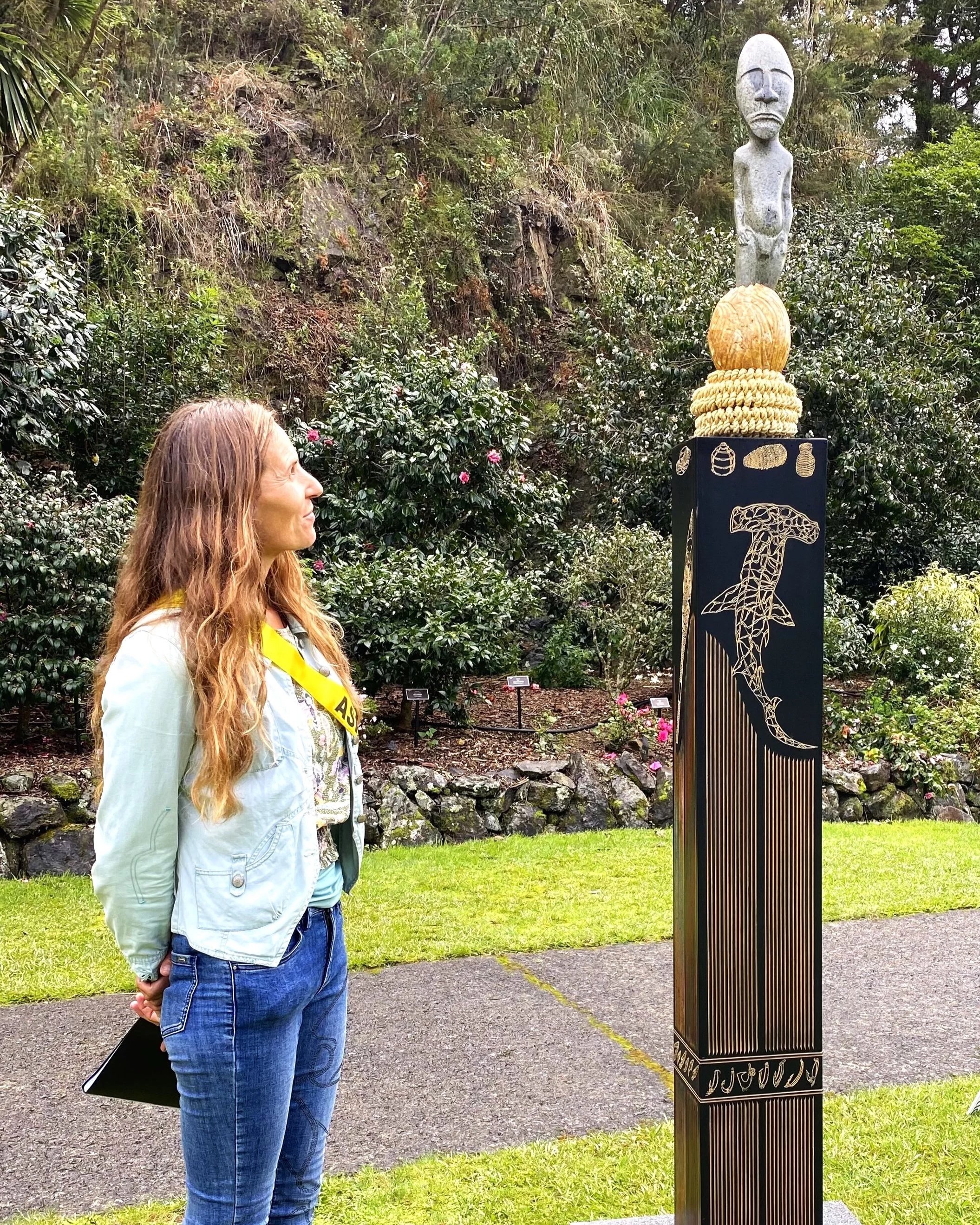 The pou functions as a vertical narrative structure, situating the figure within a cosmological framework of emergence and continuity. Together, figure and support propose a reading of leadership not as dominance, but as bearing: a holding of ancestral knowledge, cultural memory, and collective presence across time.
